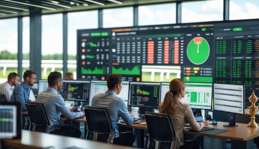 Seorang profesional sedang menganalisis data pacuan kuda di kantor modern dengan layar digital dan komputer.